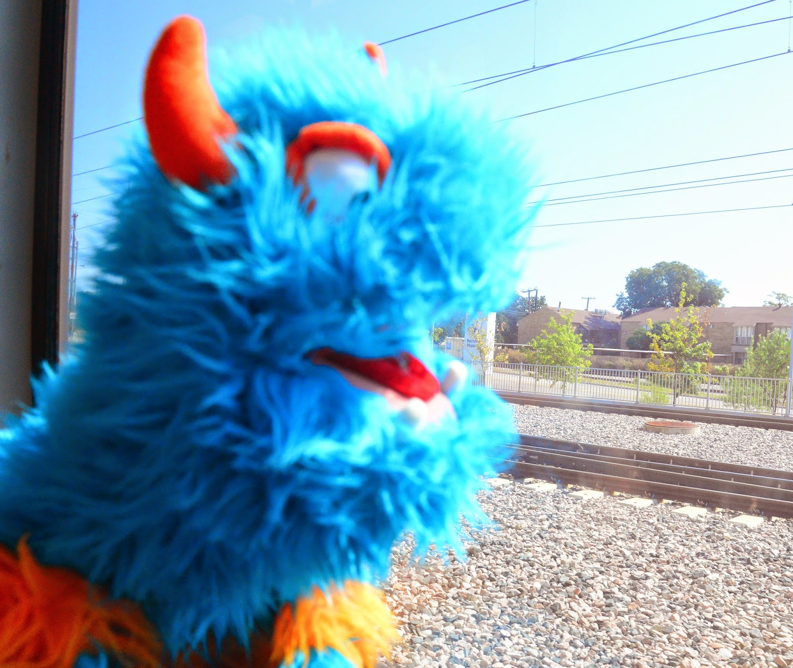 In the background is a DART guy smiling at all of us, or maybe he is surprised to see a furry blue and orange monster riding on the train. He must not see very many blue and orange furry monsters.