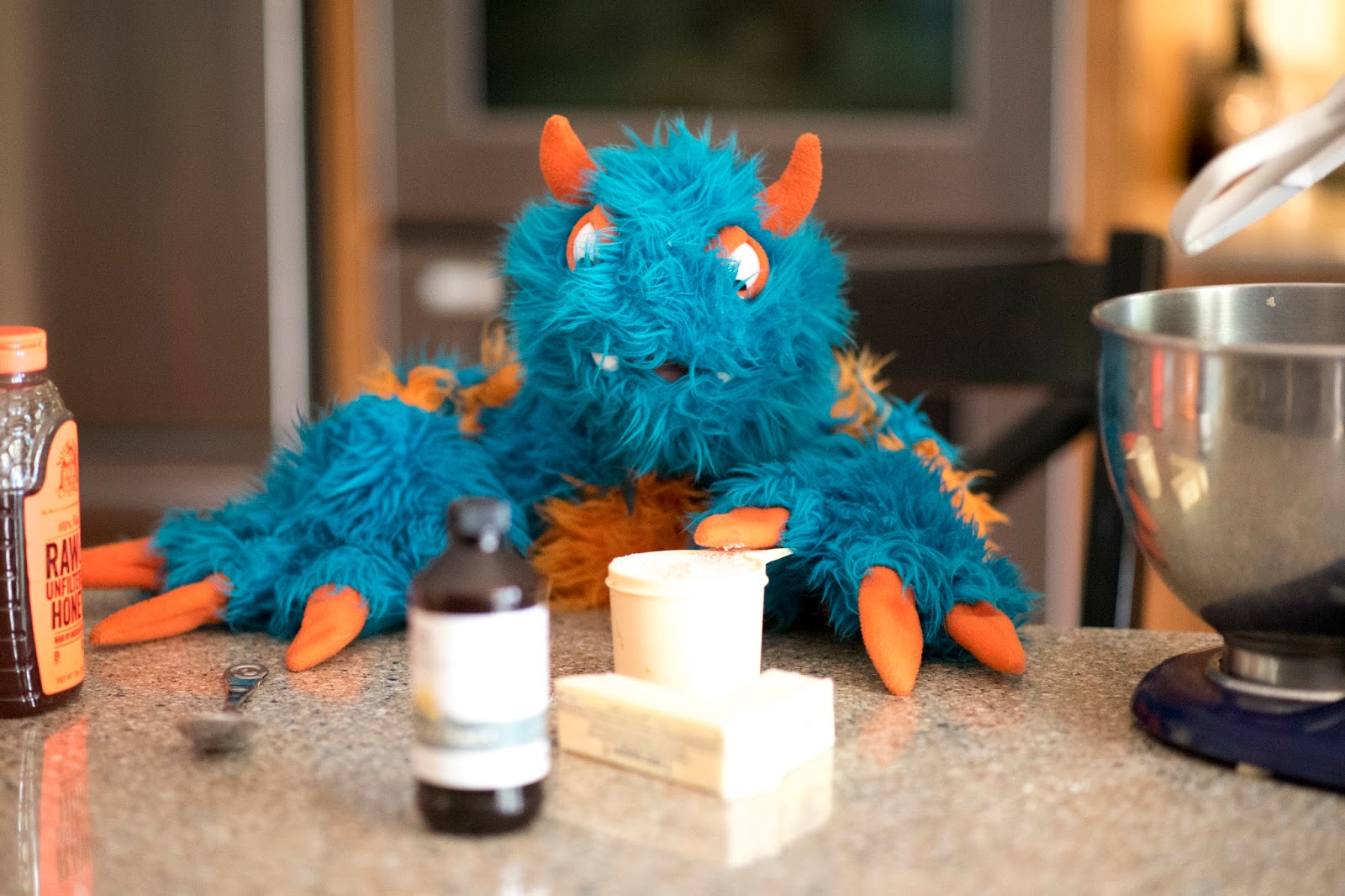For some reason, The Lady lit my muffins on fire. I thought they were already cooked when she gave them to me. This was a little confusing, but then I remembered that on your b-day you get one fire stick for each year that you have been alive. Then you make a wish and use your breath as a fire extinguisher. If your fire extinguisher works right and you extinguish all of the fire sticks at once, then your wish will come true. My extinguisher worked, but supposedly if I tell you my wish then it won’t come true. Remembering all of these b-day rules is a lot for this little blue and orange furry monster.