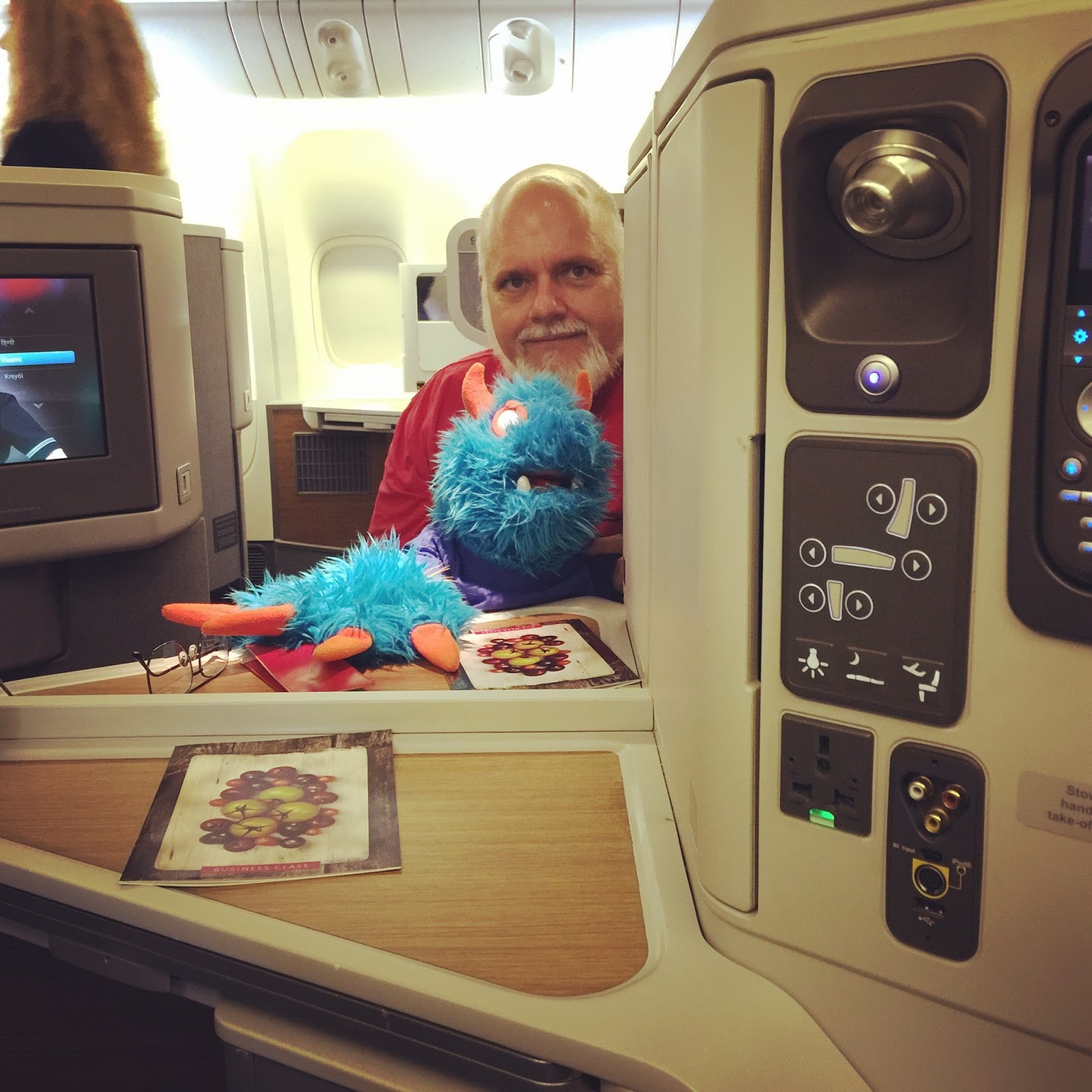 It think business class really was better! There were lots of buttons for me and Mr. Guy to push and we got lots of space and the seat folded out into a bed!