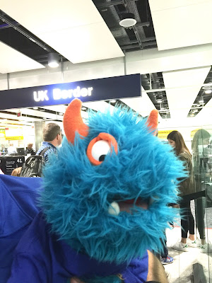 When we finally got to London and got off of the plane, we went through this place called imagination, or something like that. There we told the Great Britain person (Mr Guy says people from Great Britain are called “British”) why we were in Great Britain. The Lady and Mr Guy had to show their passports. These are little books with terrible pictures of The Lady and Mr. Guy that say that they came from the United States and that they are allowed to travel to other countries. Mr Guy said I did not need a passport because everyone wants visits from blue and orange monsters.