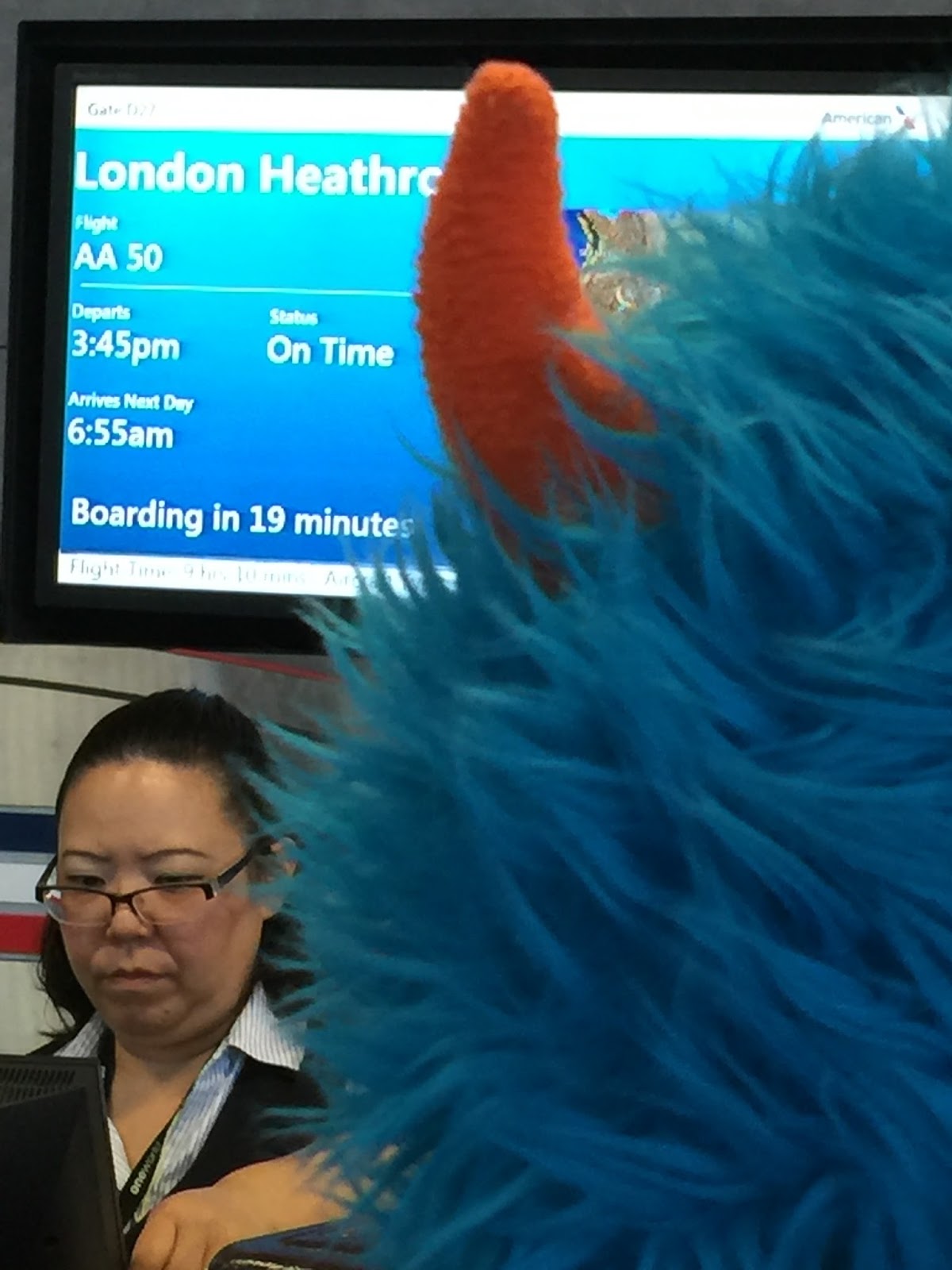 Wow I’m a little confused. I think it has been three days since we left home. It was Wednesday, but now it is Friday! The Lady says we lost six hours on the plane. Disappearing time is too much for a little blue and orange monster to understand.