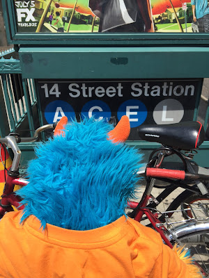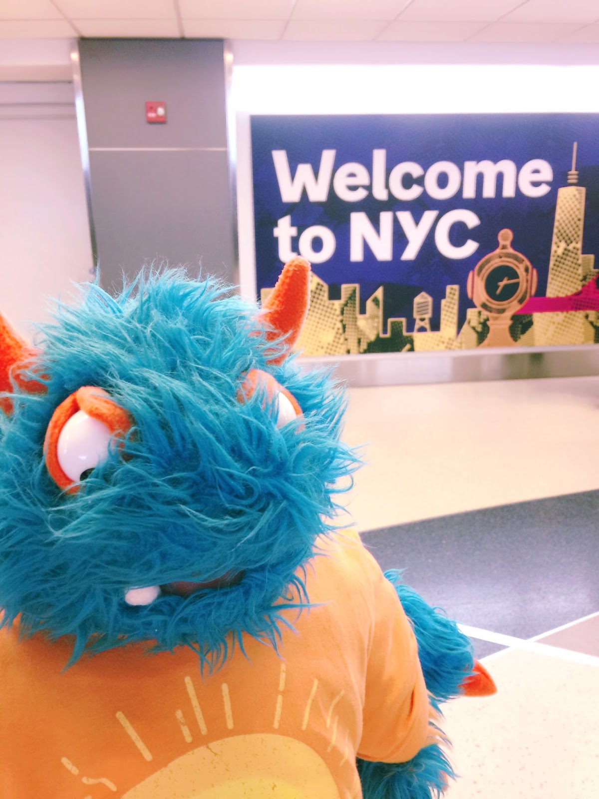 This week was both fun and a little strange.  I went on an adventure.  And The Lady went on the adventure.  But, Mr. Guy did not go on this adventure with us.  We went to New York City.  Mr. Guy had important stuff to do here at home.  Plus, he said that he doesn’t really like New York City.  That made me a little nervous.  I was afraid that I wouldn’t like it either, but I decided to be a brave little blue and orange furry monster and go.  I hoped that The Lady, Offspring #2, and The Young Guy would take good care of me.