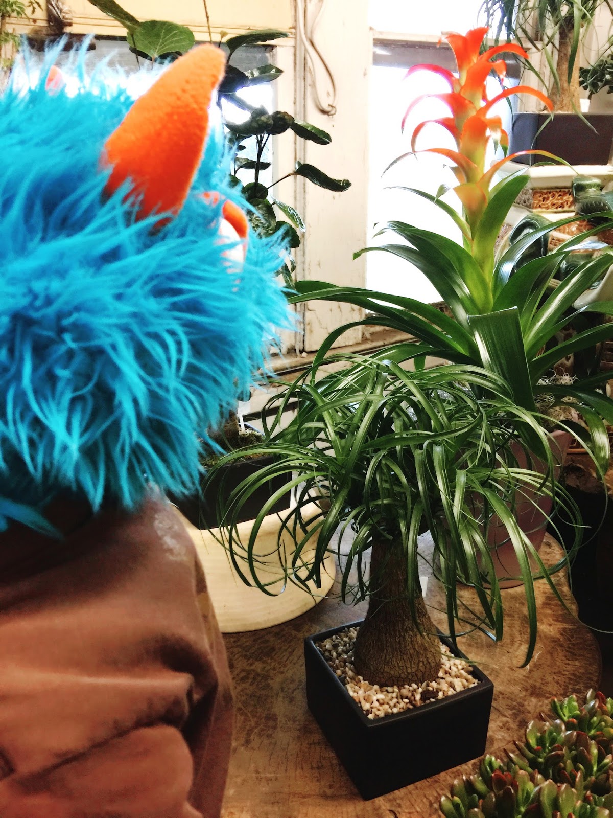 So as it turned out, I learned how to take care of these little trees rather than how to be a secret agent. I didn’t get to ride in a fancy car, but I did get to pick out a bonsai tree.  Mr. Guy and I decided to get a ponytail palm.  Mr. Guy said that The Captain had one in Delaware and that he had hoped we could bring it back to Texas, but that didn’t happen.  So, we got our own.  And as it turned out, my dirt shirt was the perfect thing to wear!