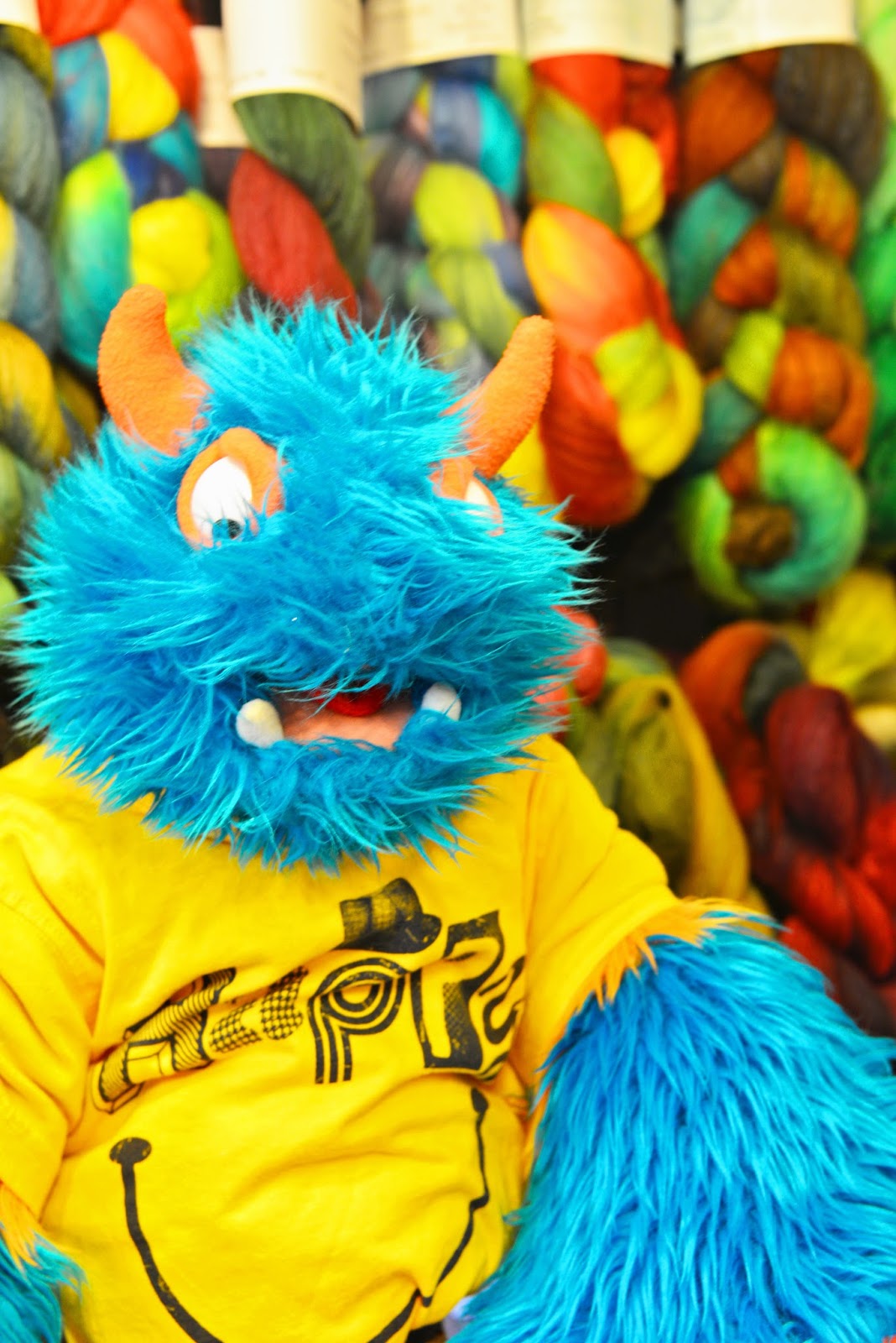 Saturdays are usually chore day at our house because its the only day that Mr. Guy and The Lady have to clean and do laundry and buy groceries.  Today was different.  Since The Lady is all done with school, she can do all of those things on Monday.  So, today wasn’t chore day; it was adventure day!  That made me happy so I decided to wear my “happy” shirt.  And it is yellow!!!  In all of my wondering this week about how my blue and orange fur would look with the color yellow, I forgot that I already had something yellow!  I don’t think it crashes clashes.  Yellow is a happy color just like my shirt says.  It makes me happy and going on adventures with The Lady and Mr. Guy makes me happy!  Today I am a happy little monster!