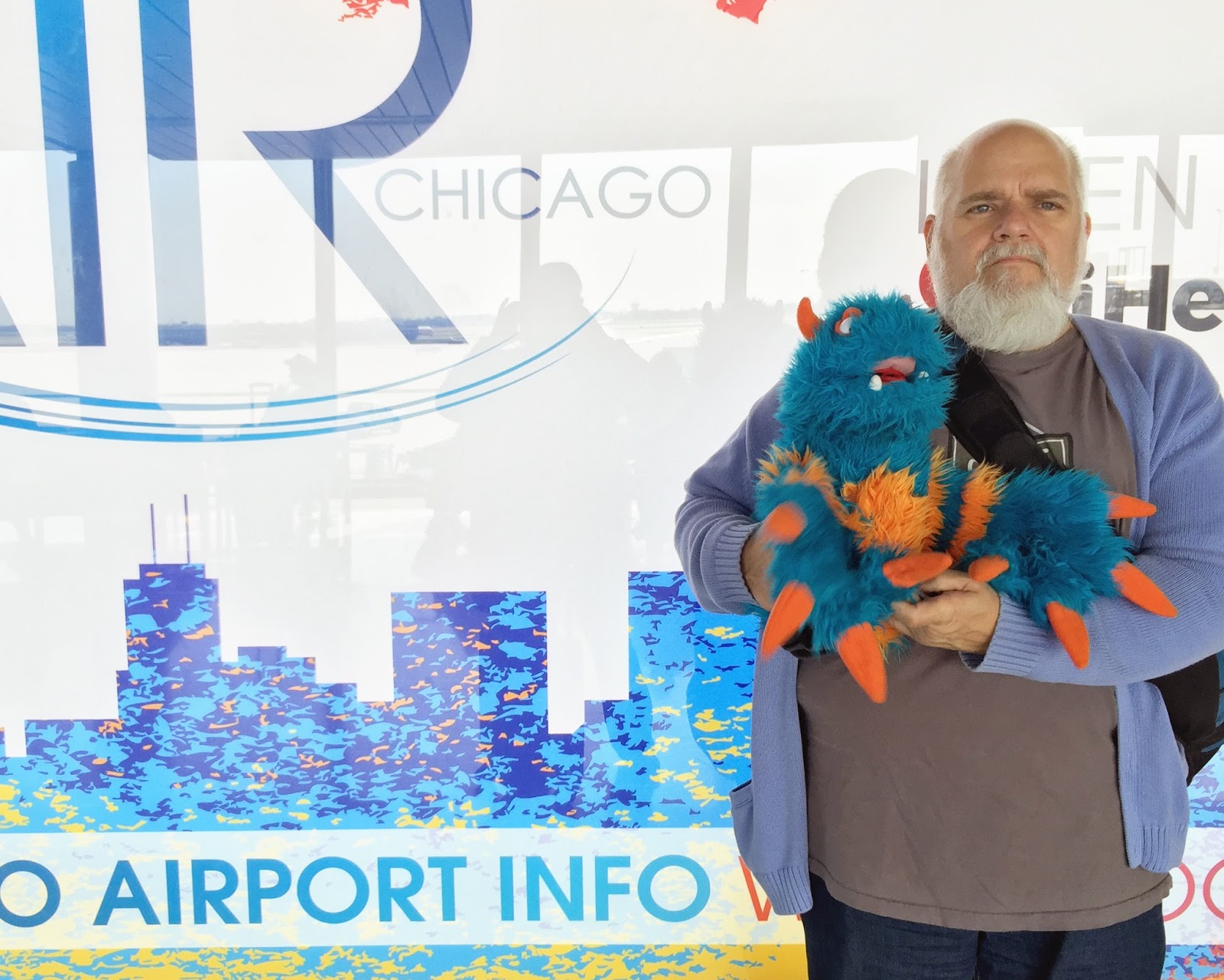 Mr. Guy, Mr. Scott F (Ms. Joni’s brother) and Mr. Scott G (Ms. Cindy’s Mr. Guy) don’t know how to play with sticks and string and they don’t have any interest in learning. The boys would all much rather play with trains. Since I am a boy, I spent my day with them. I think that a little blue and orange furry monster with sticks and string might be a disaster. I like it when Ms. Joni and The Lady work their magic with the string and I end up with sweaters and hats that are already made!