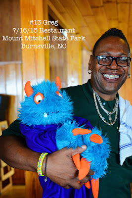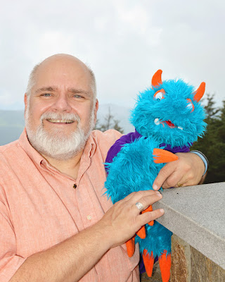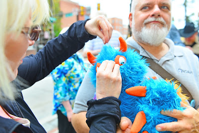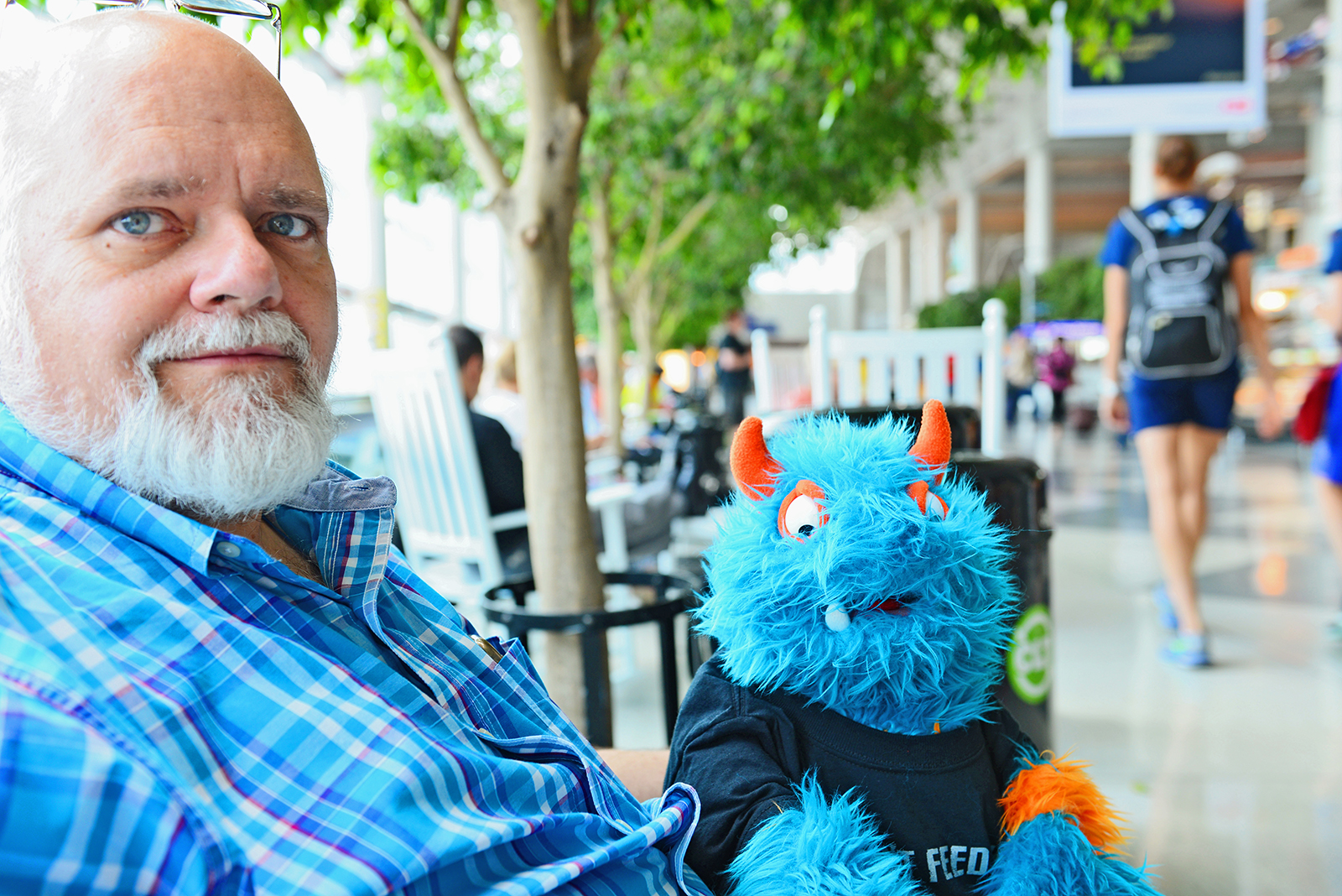As usually, Mr. Guy was carrying me when we walked into the hotel. Several people called out, “Look! It’s Blueper B!” I wasn’t sure who any of these people were or how they knew me. Mr. Guy said that he bet that they read my blog and that’s how they knew who I was. I felt kind of like a monster star. I got to talk to people, shake hands with them, and have my picture taken with them! The first one is with Joni. She and The Lady are good friends. They have lots of things in common like this thing they do where they tie string together with two sticks. Somehow they make the string turn into objects like hats and socks. They call it knitting. I think it’s some kind of magic trick. Maybe they could knit me a magic T-shirt.